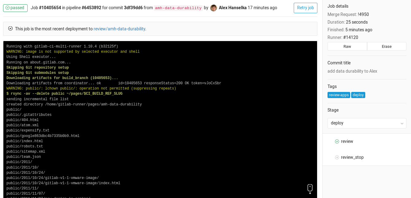 If everything runs OK (no non-zero return values), you'll get a nice green checkmark associated with the pushed commit or merge request. This makes it easy to see whether a merge request caused any of the tests to fail before you even look at the code.