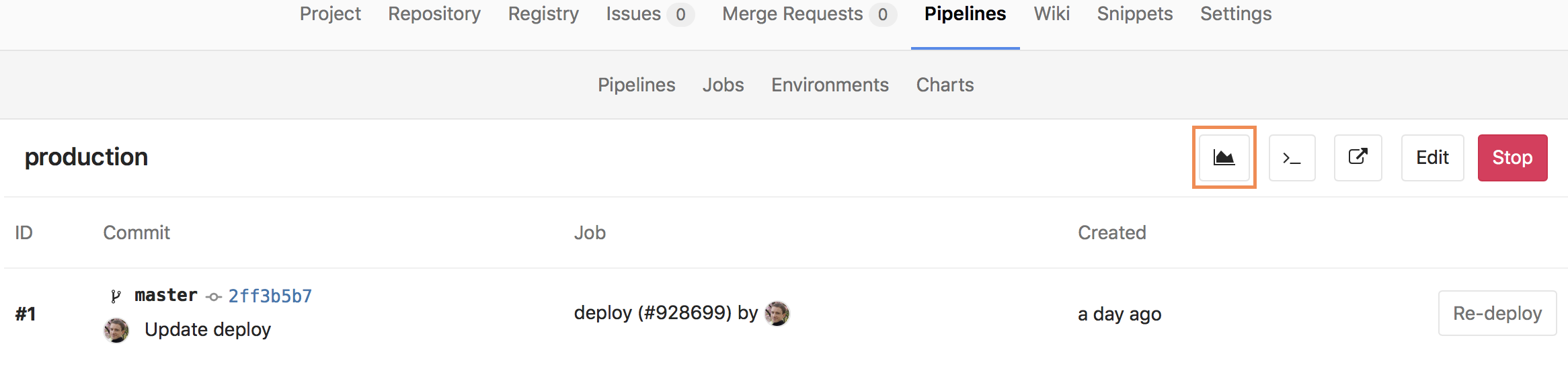 Once configured, GitLab will attempt to retrieve performance metrics for any environment which has had a successful deployment. If monitoring data was successfully retrieved, a metrics button will appear on the environment's detail page.