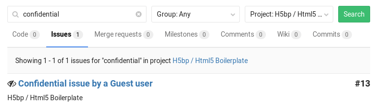Confidential issues are also hidden in search results for unprivileged users. For example, here's what a user with Master and Guest access sees in the project's search results respectively.
